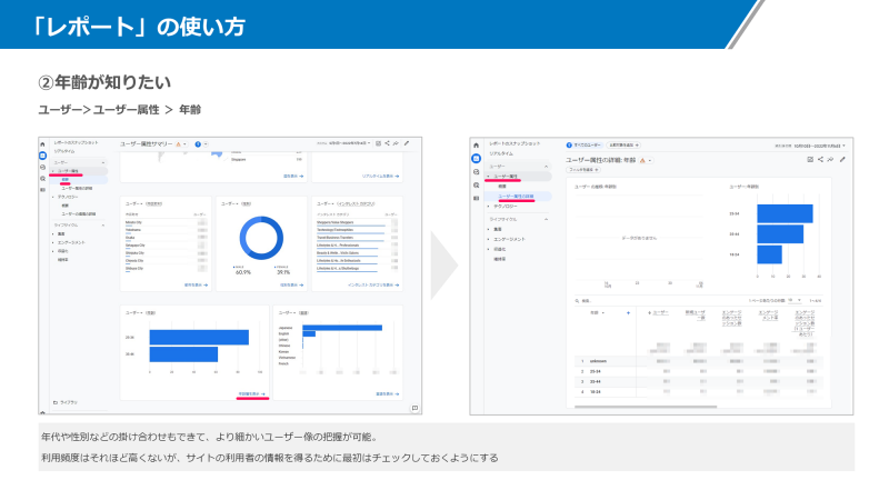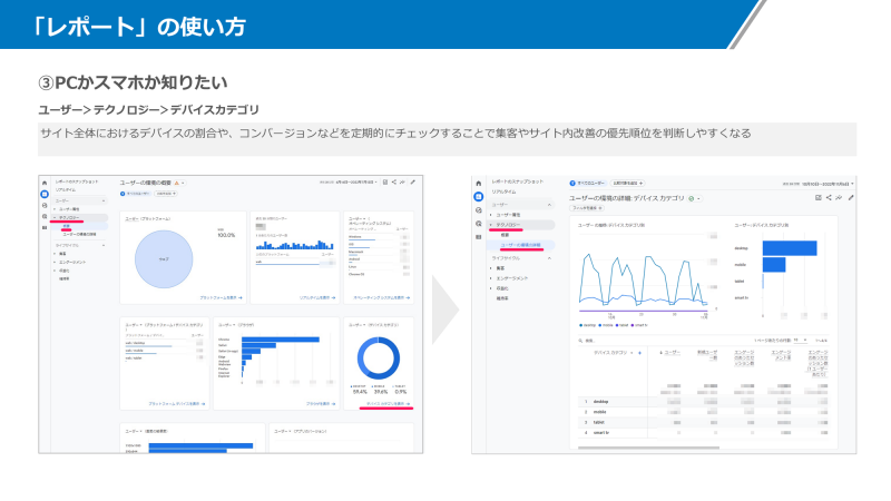 スライド左側が「レポート」です。あらかじめ用意された項目の中から、見たいレポートを選択して、データを確認するという使い方です。主にサイト全体の状況を把握したい場合に利用します。