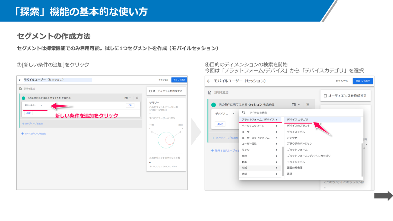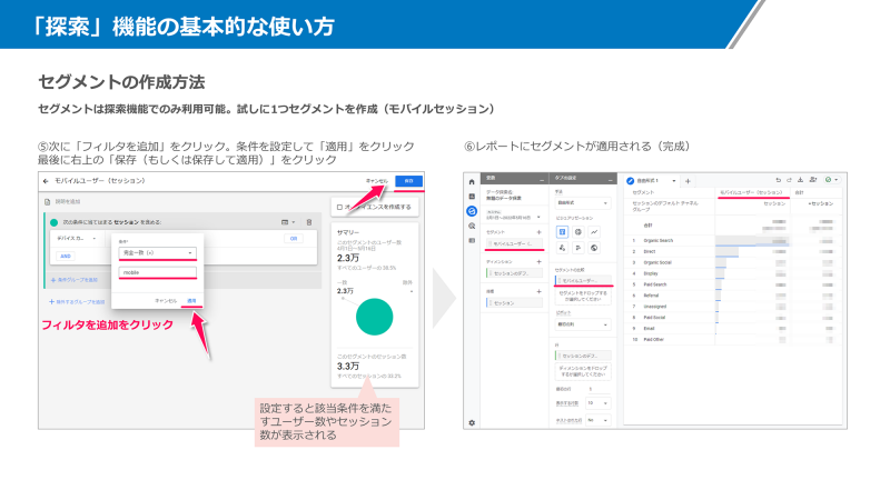 スライド右側が、「探索」です。自分でディメンション、指標、セグメントを掛け合わせて、出したいグラフやデータを作成していくという使い方です。こちらは、課題発見や深掘り分析をしたい場合に利用します。