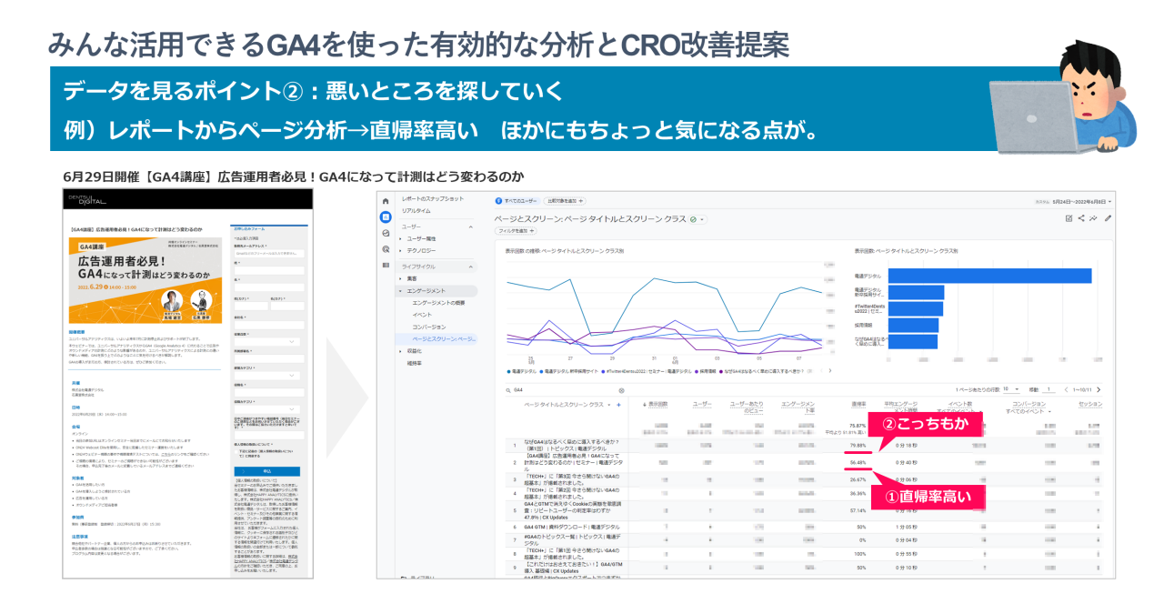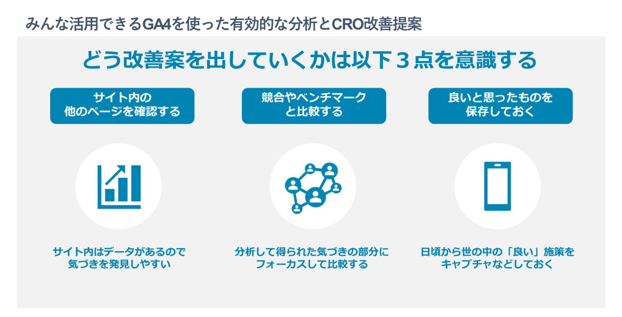 GA4を見るときは、ただレポートを見るだけでなく、常にどこか改善できるところはないかと探す姿勢が大事です。「対象を決める」→「悪いところを探す」→「仮説を立てる」という流れを意識し、こまめに改善施策を実施してみてください。