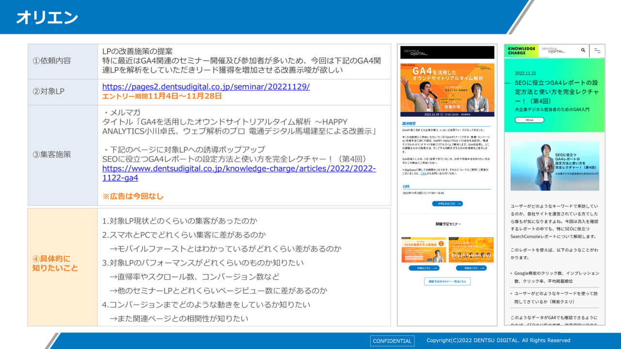 依頼内容は「セミナーLPの改善施策を提案してほしい」。最近、GA4関連のセミナー開催および参加者が多いので、リード獲得数を増加させる改善施策が欲しいということです。