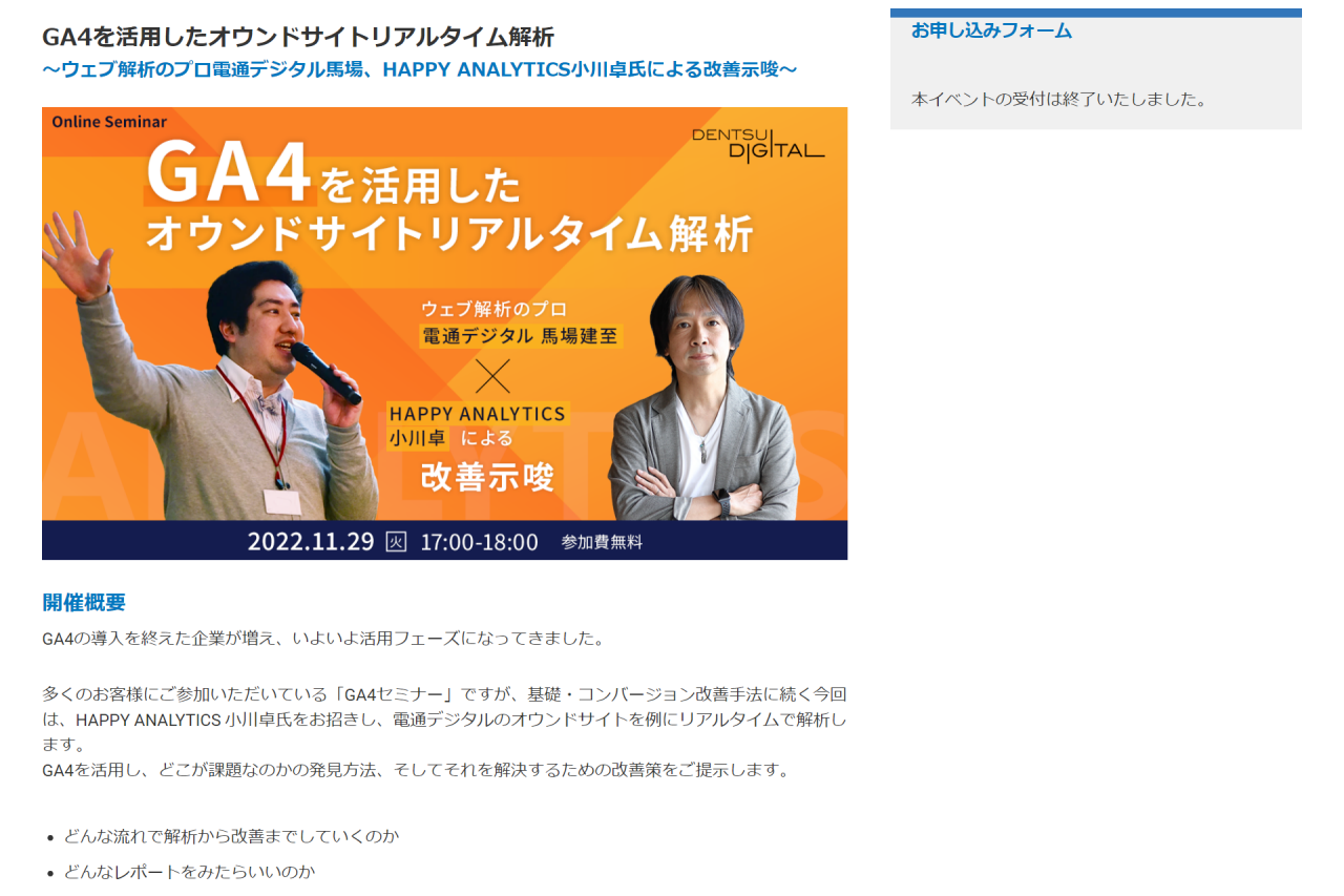 本記事では、HAPPY ANALYTICS 小川卓氏と電通デジタル 馬場健至が、電通デジタルのオウンドサイトをリアルタイムで解析し、GA4を活用した課題の発見方法と改善策の考え方を紹介します。