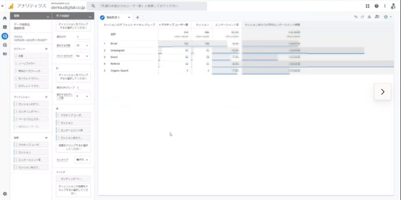 馬場 : ではここからはGA4を使って分析を進めます。「探索」の「自由形式」を開いて、次のディメンションと指標を追加します。