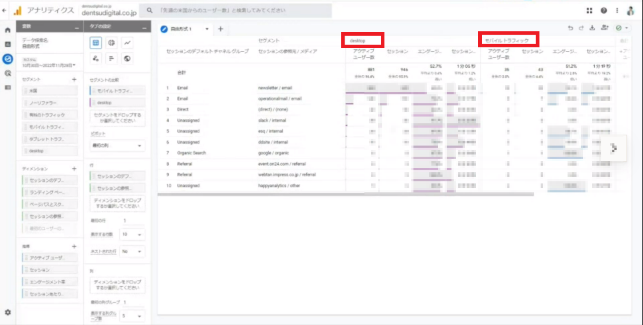 小川 : 次に、デバイスごとの流入を見てみましょう。「モバイルトラフィック」「desktop」のセグメントをかけて比較してみると、どうでしょうか?