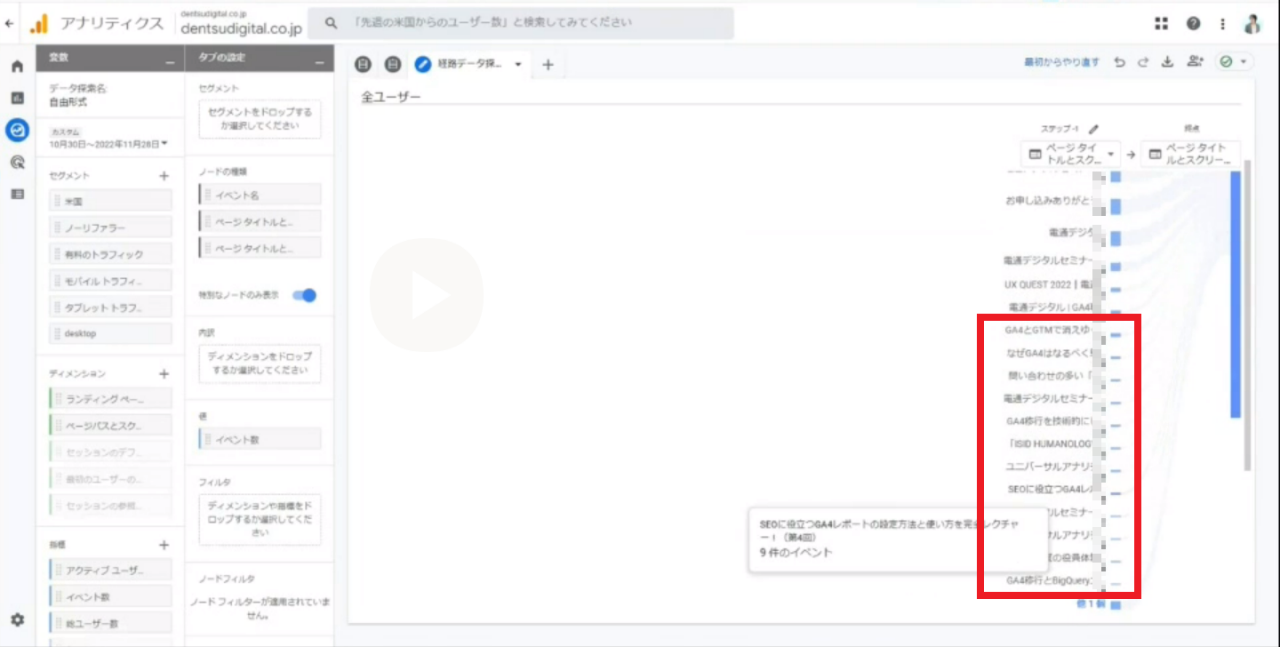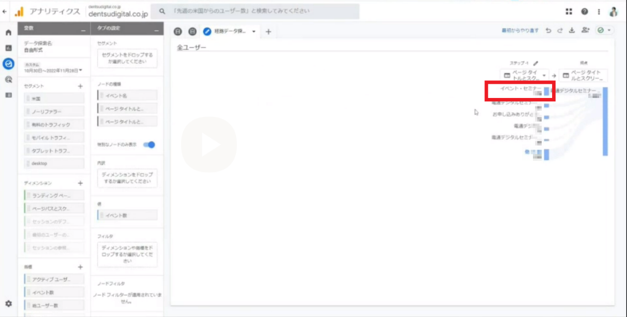 小川:次に、「経路データ探索」で、LPと他のページの行き来がどれぐらいあるかを見てみましょう。行き来の数はそれなりに多そうです。他のセミナーのLPをけっこう見ていますね。行き来をしているということは、ユーザーはどのセミナーが自分に合っているかを知りたいのだと思います。