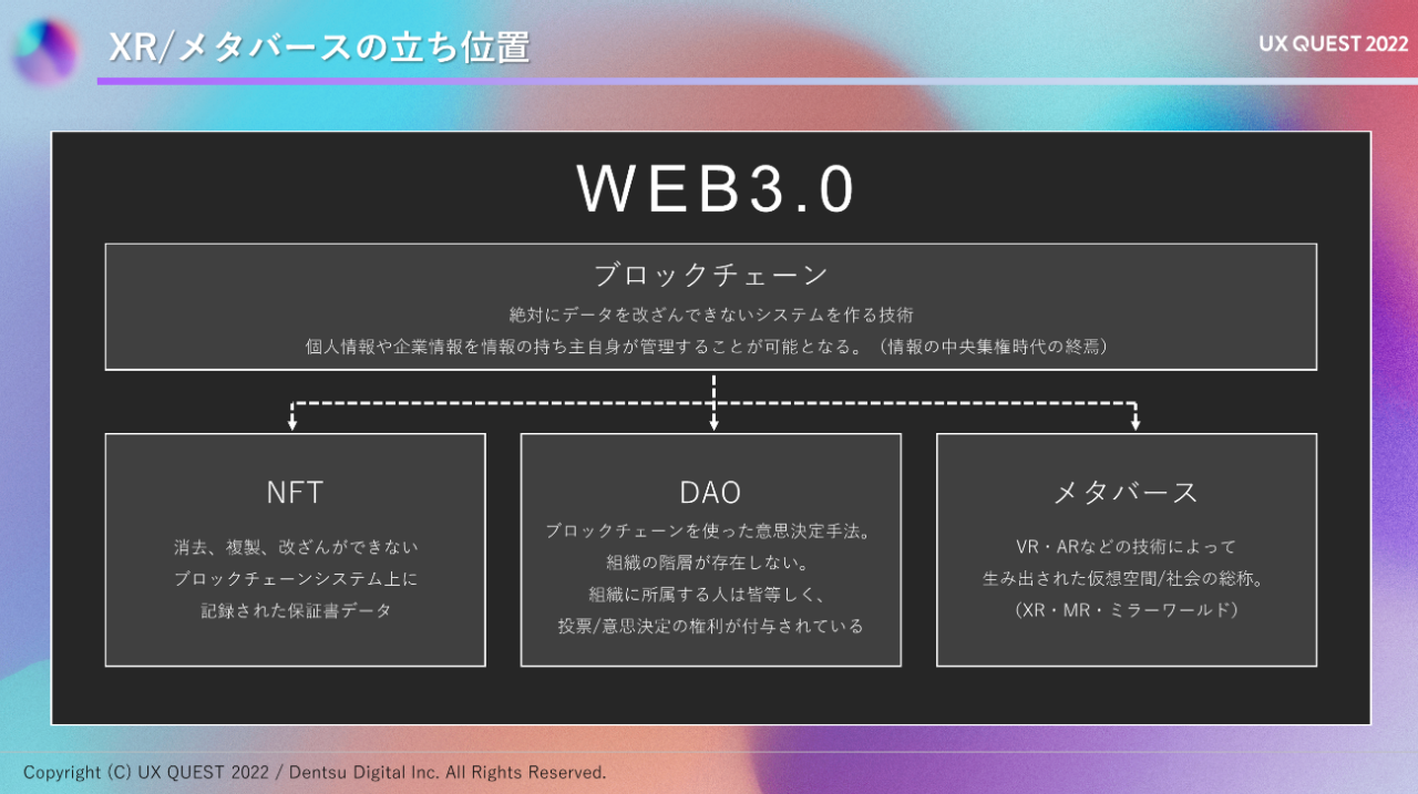 メタバースの中で過ごす時間が増え、経済活動ができると、デジタルもリアルの一部になる。すると、デジタルアセットがリアルでも価値を持つようになってくると思います。