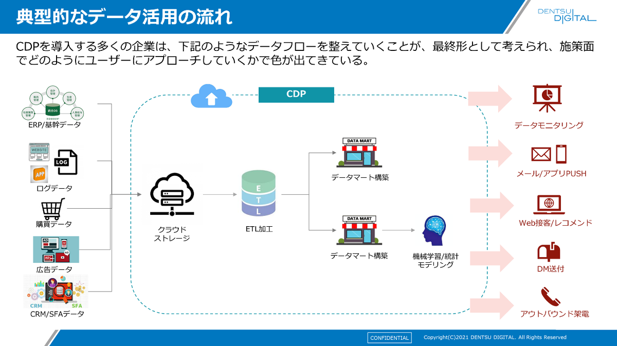 データ活用で何ができるかですが、典型的な流れを図にまとめました。CDPは、さまざまなデータを集めていったん貯蔵し、加工や計算をして施策ツールにつなげるためのものです。