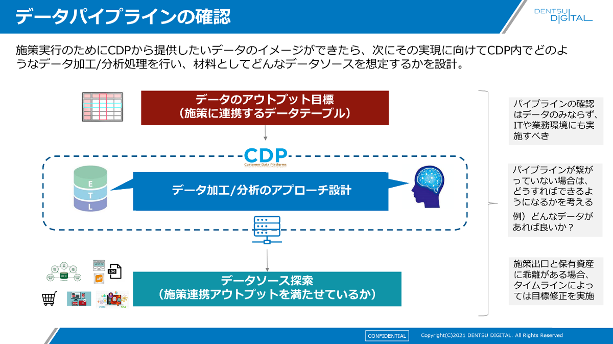 もうひとつ意識していただきたいのが、「データパイプラインの確認」です。パイプラインとはつながりのことで、以下の順番で確認/設計しましょう。