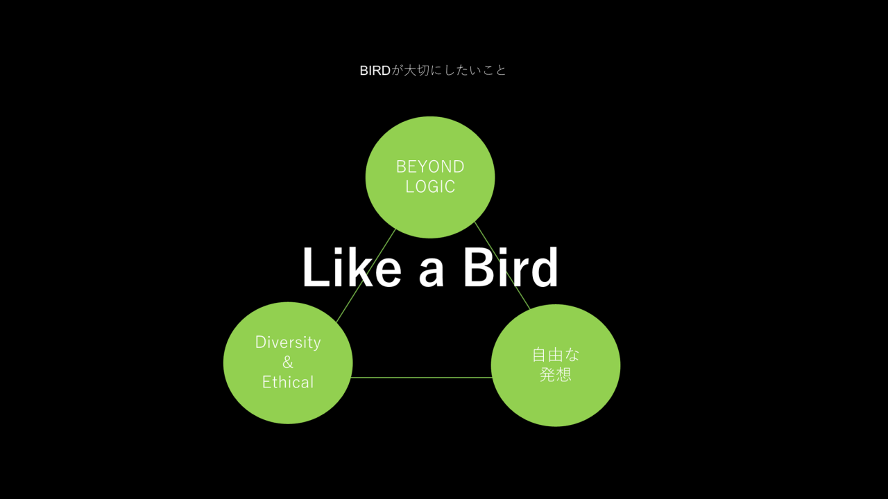このミッションを果たすために、大事にしていることが3つあります。「Beyond Logic」「Diversity & Ethical」「自由な発想」です。特に「Beyond Logic」は、「人の気持ちが動く、心地よいビジネスを」という言葉を添えて、電通デジタルBIRDのスローガンにしています。