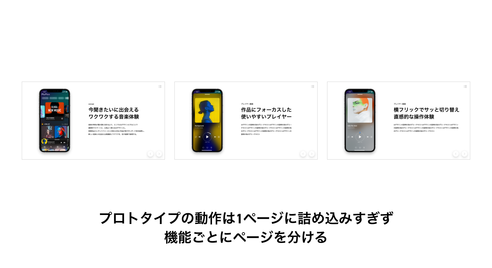 しかし、デザインだけを表示するプロトタイプでは、プレゼン資料とは違い、表現していることや伝えたいメッセージなど、デザインを説明する上で重要な事柄をテキストで併記することができず、