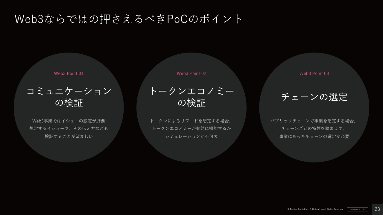 岡田 : Web3の新規事業においては、PoC(実証実験)が非常に重要です。一般的なPoCのポイントである「①目的と検証内容の明確化」「②スモールスタート」「③環境の再現」に加え、Web3のPoCでは3つのポイントを押さえる必要があります。