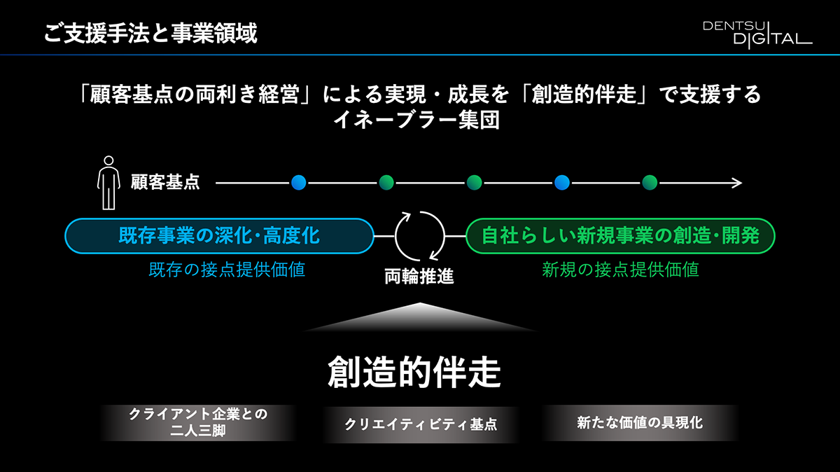 これに対し、電通デジタルのトランスフォーメーション領域は、「クライアント企業との二人三脚」「クリエイティビティ基点」「新たな価値の具現化」を特徴とする「創造的伴走」で支援します。