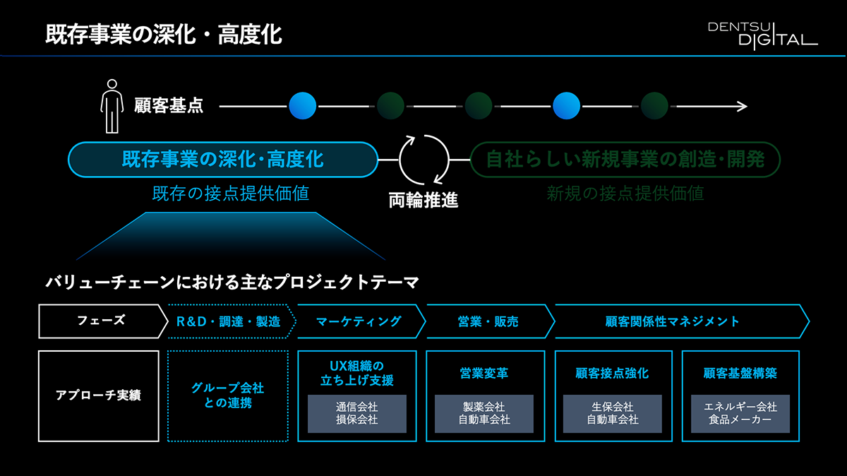 「既存事業の深化・高度化」に関しては、バリューチェーンにおける主なプロジェクトテーマとして、「R&D・調達・製造」でグループ会社との連携、「マーケティング」でUX組織の立ち上げ支援、「営業・販売」で営業のデジタル化、「顧客関係性マネジメント」で顧客接点の強化や顧客基盤の構築を行っています。
