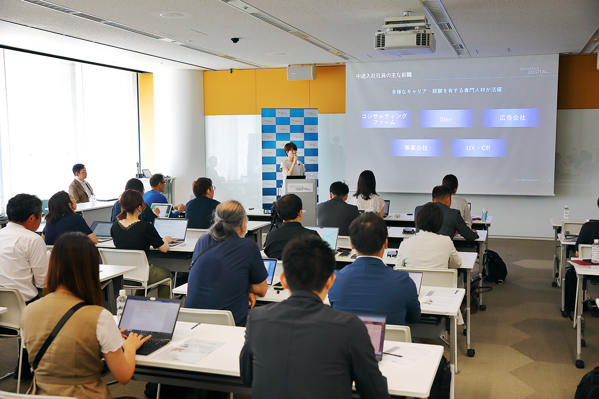 2023年7月26日に、電通デジタルはメディア向け「トランスフォーメーション領域事業説明会」を開催しました。「トランスフォーメーション領域」において行ってきたDX支援の事例を交えながら、同領域の現在の取り組みや強み、今後の事業戦略、注力領域について、代表取締役社長執行役員の瀧本恒と、執行役員の安田裕美子が説明しました。