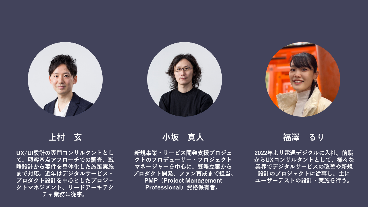 2020年に電通デジタルに入社。 ユーザー起点でのサイトディレクションやユーザーテスト、アンケート設計・分析業務、ワークショップ設計・運営業務など幅広い支援業務に従事。
