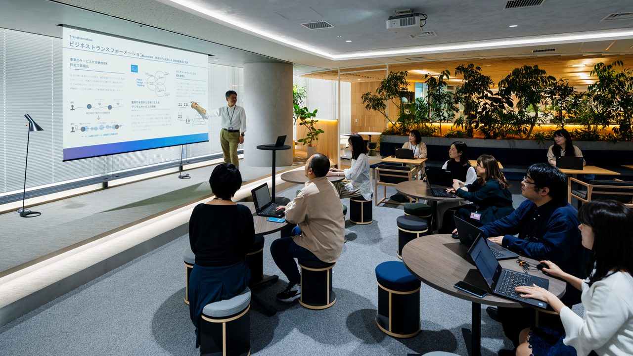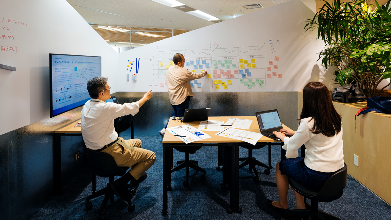私は対面ミーティング目的での出社が多いのですが、様々な大きさのミーティングスペースもあり、壁のホワイトボードに描いて議論もできるところに便利さを感じています。最近は他フロアの会議室を使う事も増えたので、予約に困ることも少なくなりました。」