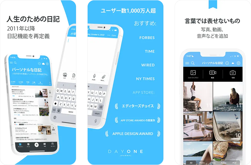 「目的が一言でいえる」という点で注目している二つのプロダクトがあります。一つは、アメリカの企業が2011年にリリースした「Day One Journal」という日記アプリです。2012年に Mac App of the Year、2014年にApple design Awardを受賞し、現在もアップデートを重ねている優れたアプリです。2021年時点で、リリースされてから世界中で1500万回以上ダウンロードされています [注2] 。