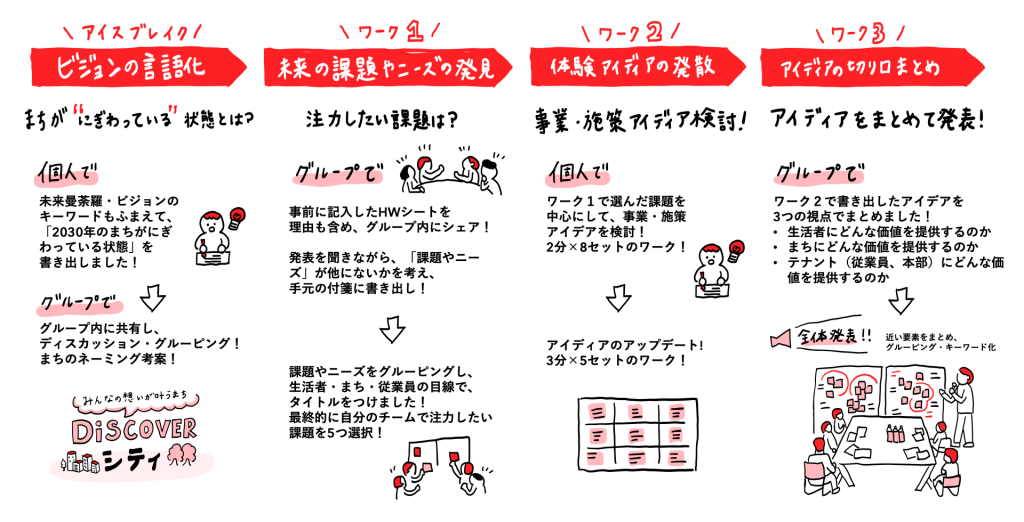 吉田:九州各地の主要な駅ビルビジネスの営業現場を担う方々も参加されていたので、ワークショップの中で生まれたアイデアを社内に持ち帰り、共有・浸透させるにはビジュアルで伝える方法が効果的だと判断しました。
