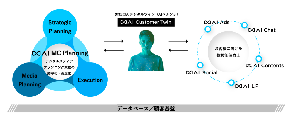 中心に位置するのが、クライアント企業固有のデータを基に生成するデータ駆動型AIペルソナ「∞AI Customer Twin」です。このAIペルソナを軸として、デジタル分野のメディアプランニングや実行・効果検証を担う「∞AI MC Planning」、リサーチやカスタマージャーニー設計、CX企画全般を担当する「∞AI CX Planning」が連携します。