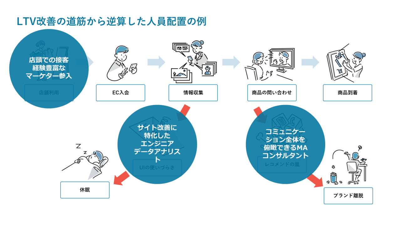 ただし、改善すべき課題が顕在化するたびに人員を補充していては、迅速な改善は見込めません。改善体制を構築することが持続的なLTV向上・事業成長に必須です。