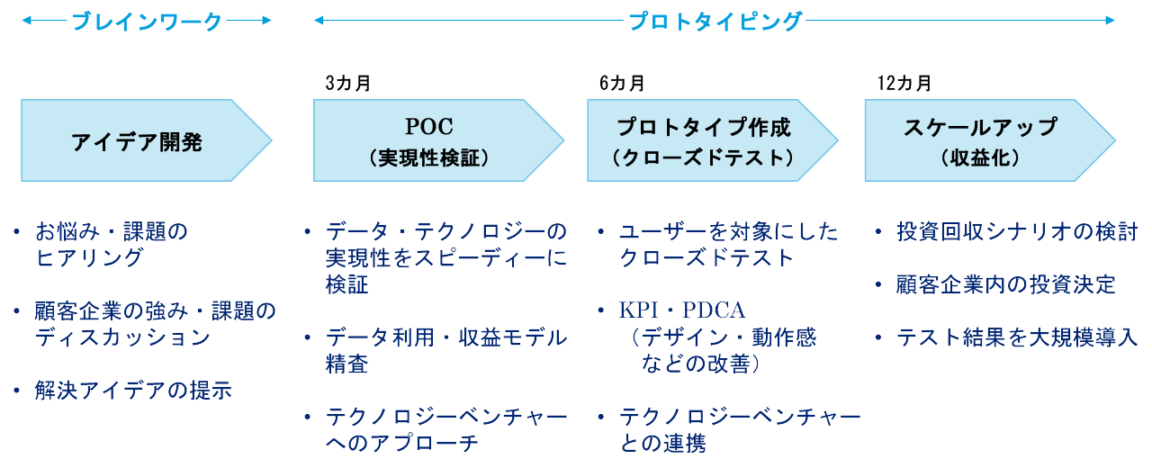 今回のプロトタイピングサービスでは、戦略的ITコンサルティング事業を運営するウルシステムズ株式会社の協力なども得て、プランナー、クリエーター、テクノロジスト、データサイエンティスト、プロデューサーなどで編成される統合チームが、アイデア開発からテクノロジーベンチャーへのアプローチと連携、プロトタイプ開発、事業性検証、市場ローンチまでをワンストップで行います。