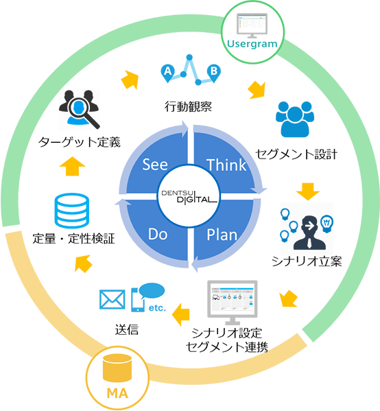 本サービスでは、分析プラットフォームとして「ユーザグラム」を活用し、電通デジタルが各種MAのシナリオPDCA支援をトータルで実施します。これにより、顧客行動に基づいたコミュニケーションシナリオの構築、運用が実現し、顧客の事業成長およびデジタルマーケティングの進化に貢献していきます。