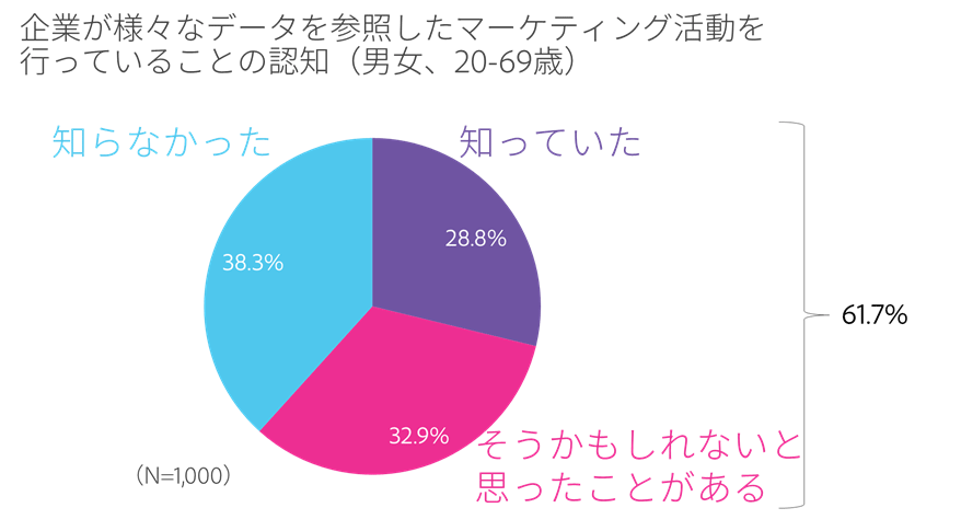 今回の調査によると、約6割(61.7%)の消費者がインターネットやスマホアプリの検索や利用の状況、会員情報や購買履歴、位置情報などを企業が参照してマーケティング活動を行っていることについて、「知っていた」または「そうかもしれないと思ったことがある」と回答しています。