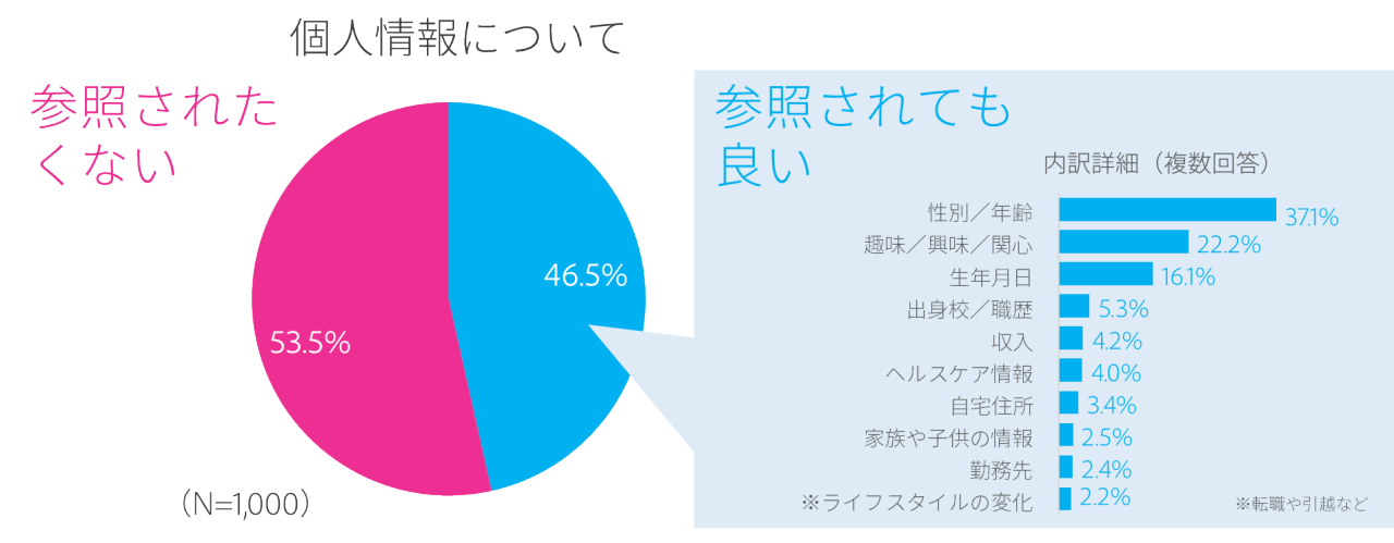 一方で、企業にデモグラフィック情報等の個人情報を参照されても構わないかという質問に対しては、「参照されたくない」という回答は約5割(53.5%)に留まりました。このうち「個人情報」の中で、どのようなデータであれば参照されても構わないか聞いたところ、「性別/年齢」(37.1%)や「趣味/興味/関心」(22.2%)は比較的高い結果だったのに対して、「転職や引越のようなライフスタイルの変化」(2.2%)は低い結果となりました。