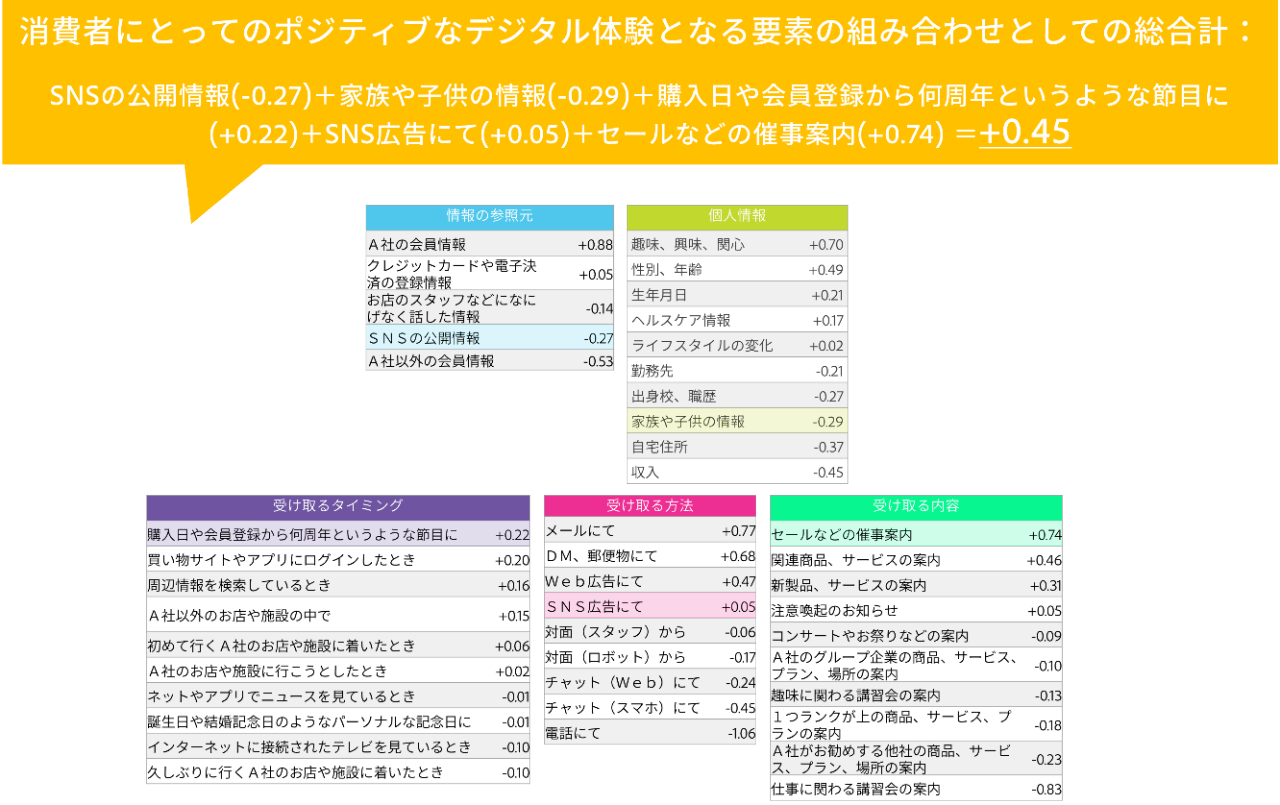 例えば、情報の参照元であるSNSの公開情報 (-0.27) で、個人情報の家族や子供の情報 (-0.29) を参照されることには抵抗が強いものの、受け取るタイミングが購入日や会員登録から何周年というような節目であり (+0.22)、受け取る方法はSNS広告 (+0.05) で、その内容がセールなどの催事案内 (+0.74) を受け取れば、合計 +0.45 となり、消費者にとってポジティブなデジタル体験になり得るとの結果となりました。