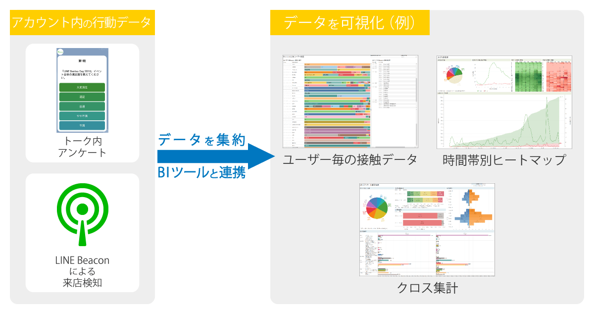 トーク内アンケートの回答やLINE Beaconへの接触状況、メッセージのクリックなどのアカウント内の行動データは、個人を特定しない形で「BOT BOOSTaR™」を通じて外部のBIツールと連携します。ユーザーのアクションを可視化することによって、次の施策に向けたPDCAの回転や、LINE Beaconの接触データから来店率を測定し、オンオフ統合プランニングも可能にします。