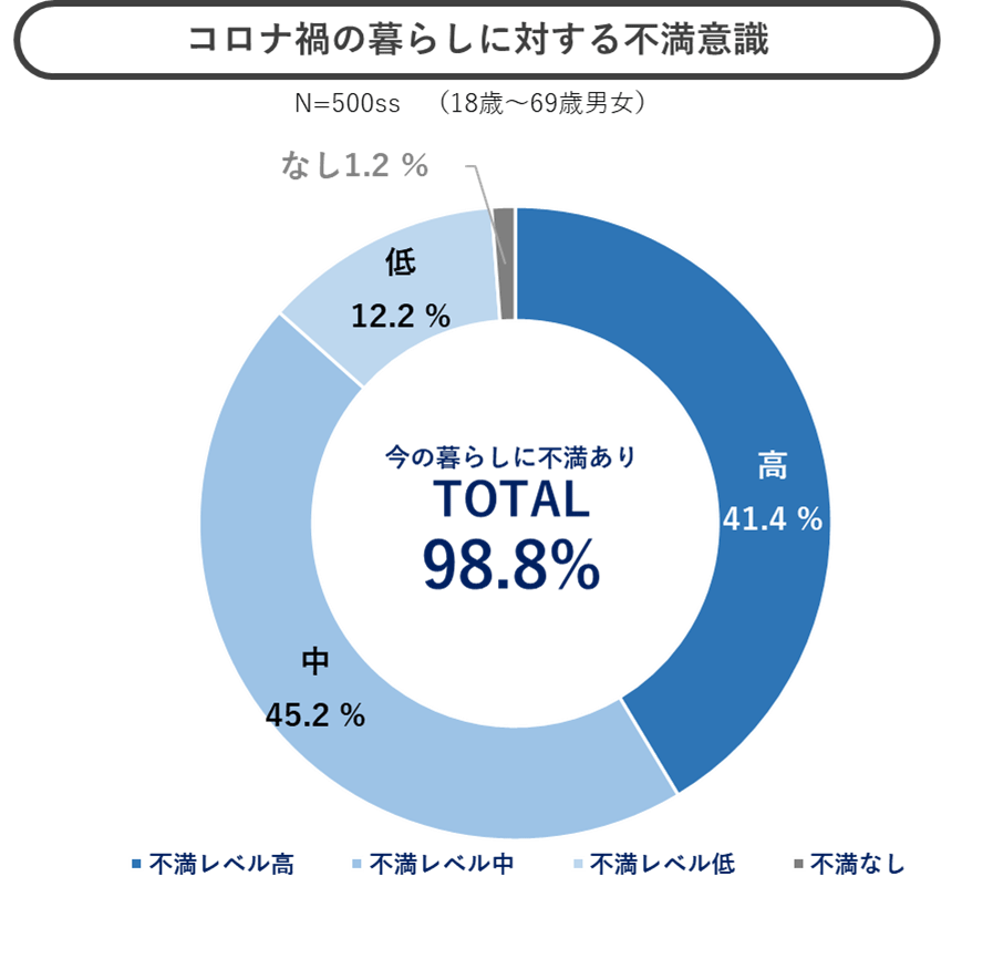 ①生活者の98.8%はコロナ禍で変化した暮らしに不満を抱いており、約4割は特に高い不満を持っていることが伺えます。
