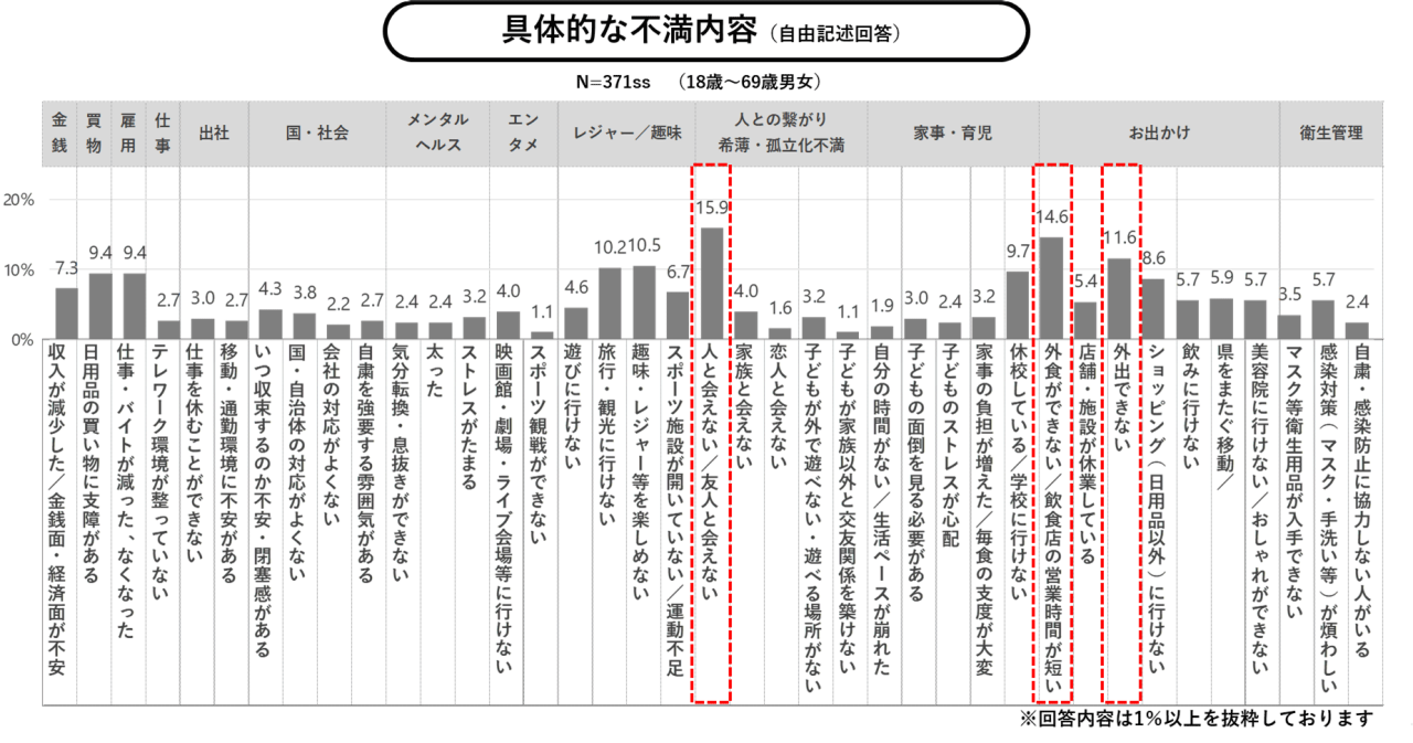 ③具体的な不満(自由回答記述結果)では、「人・友人と会えない」(15.9%)が最も多く、「外食ができない、飲食店の営業時間が短い」(14.6%)、「外出できない」(11.6%)が続きました。