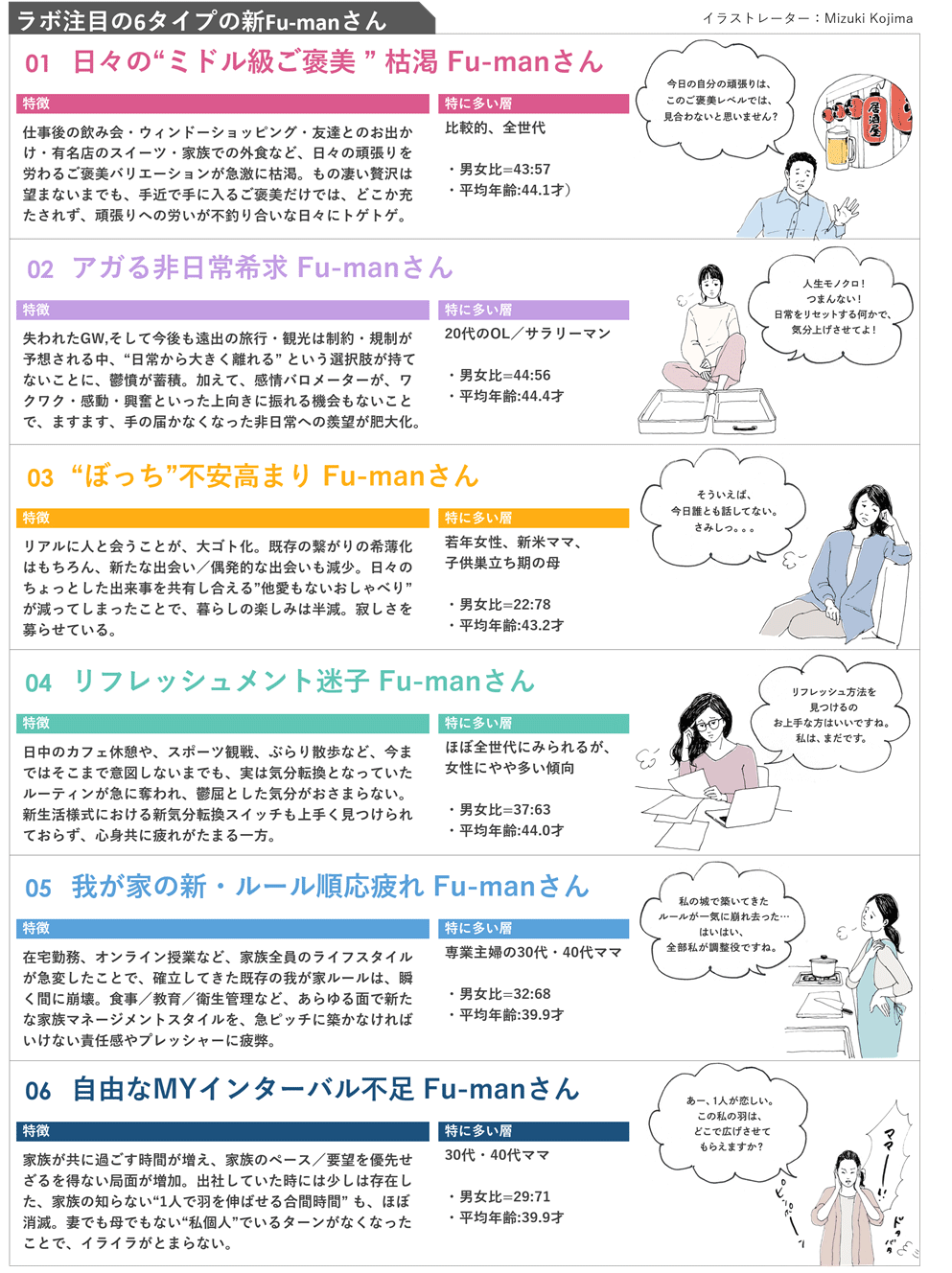 ④③の具体的な不満内容の結果を踏まえ、ラボではこれからの社会で予想される不満傾向を6タイプの"新Fu-manさん"としてカテゴライズしました。