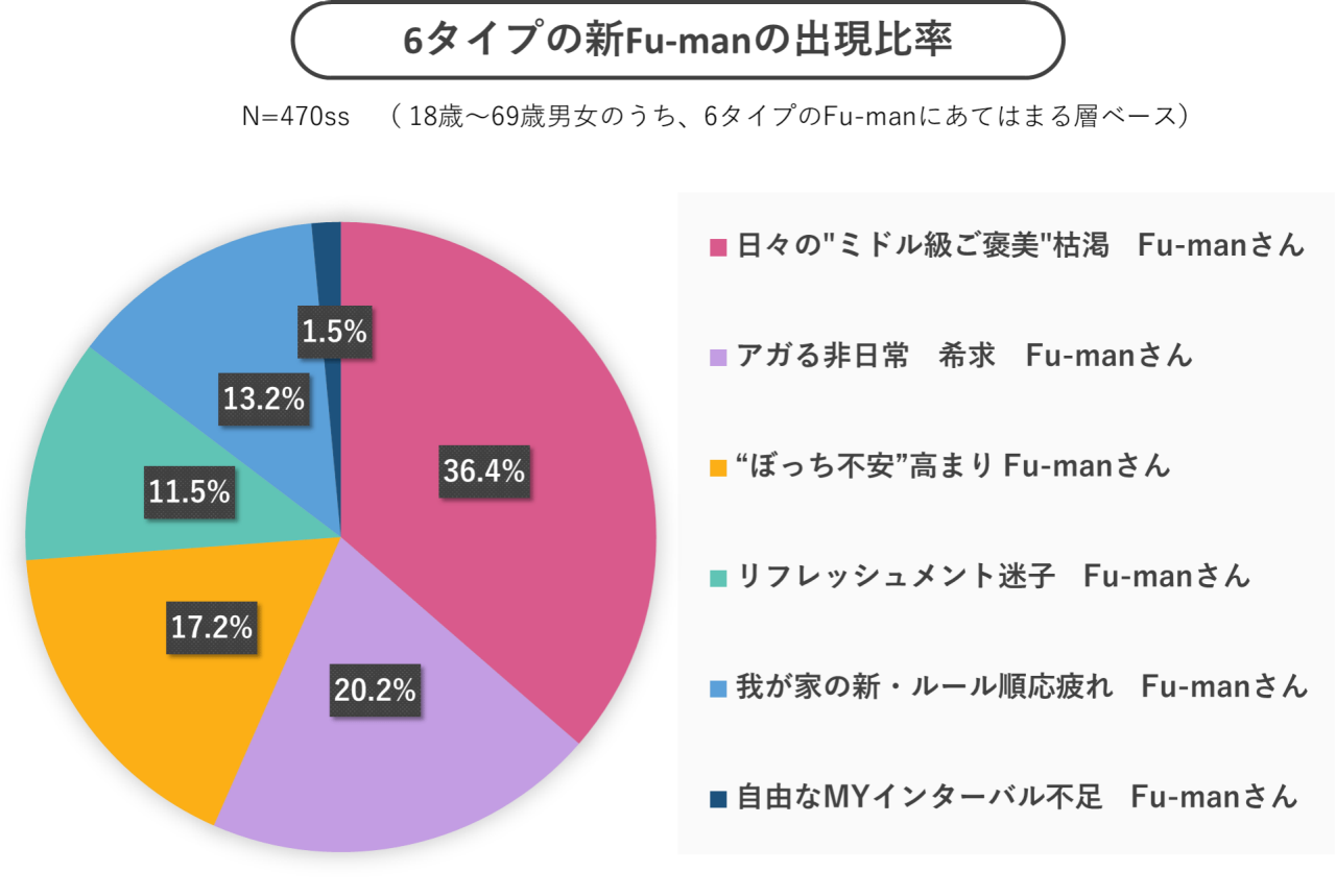 ⑤6タイプの中で、最もボリュームを占めるのは、「日々の"ミドル級ご褒美"枯渇 Fu-manさん」です。コンビニスイーツのような"プチご褒美"は制約ある暮らしの中でも比較的手に入る一方で、"とっておき"と"プチ"の間に位置する飲み会やショッピングなど日常における"ミドル級ご褒美"が暮らしから突如抜け落ちている状況です。"頑張り量は変わらないのにご褒美バリエーションが不足している"という状況が、不満を増幅させていると考えます。しかし、これらの新・Fu-manは、「強く希求する欲求の裏返し」であり、既存のモノ・サービスに囚われず、未充足欲求を充たす代替価値の提案を求めているとも考えられます。