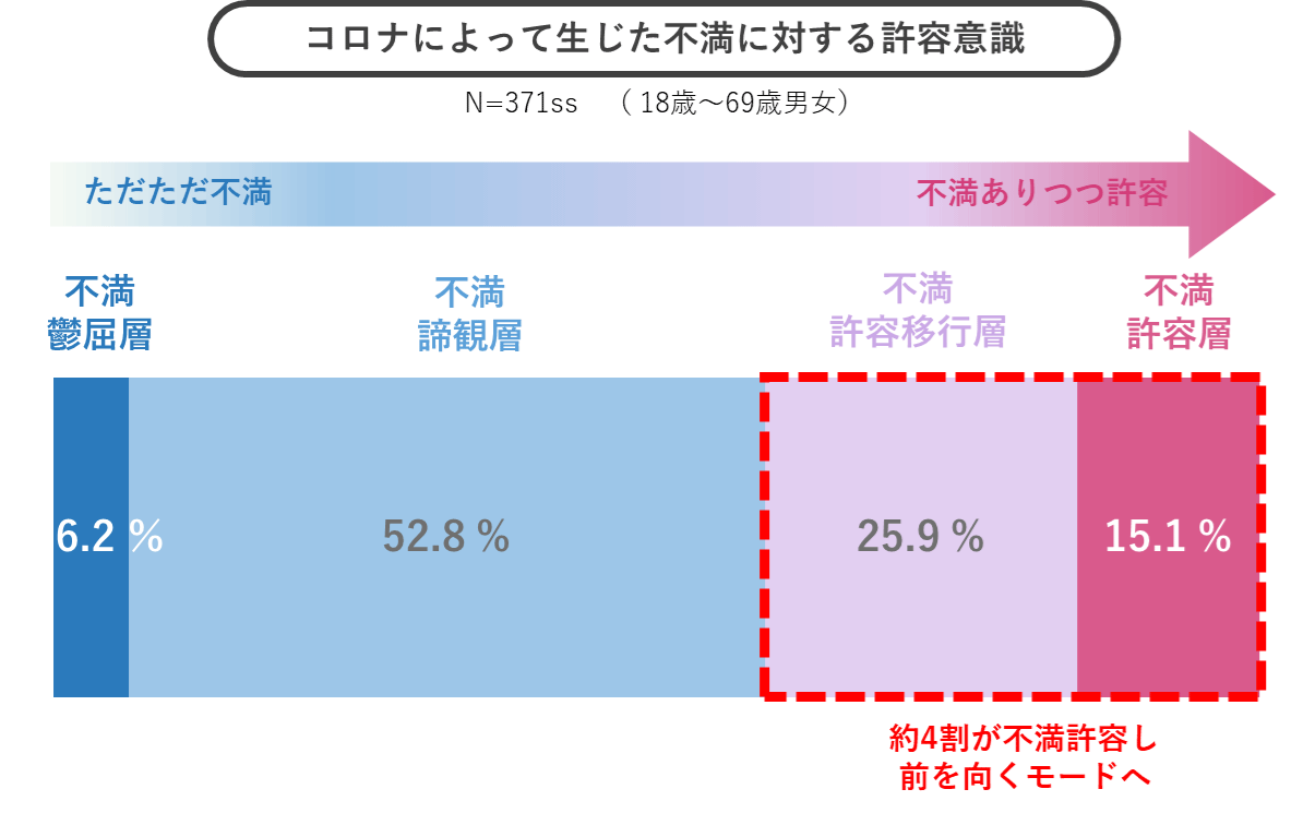 ⑥生活者の不満があらゆる分野で蓄積されている一方で、この社会に順応すべく4割が不満への許容・受容の意識を持ち始めていることも伺えます。