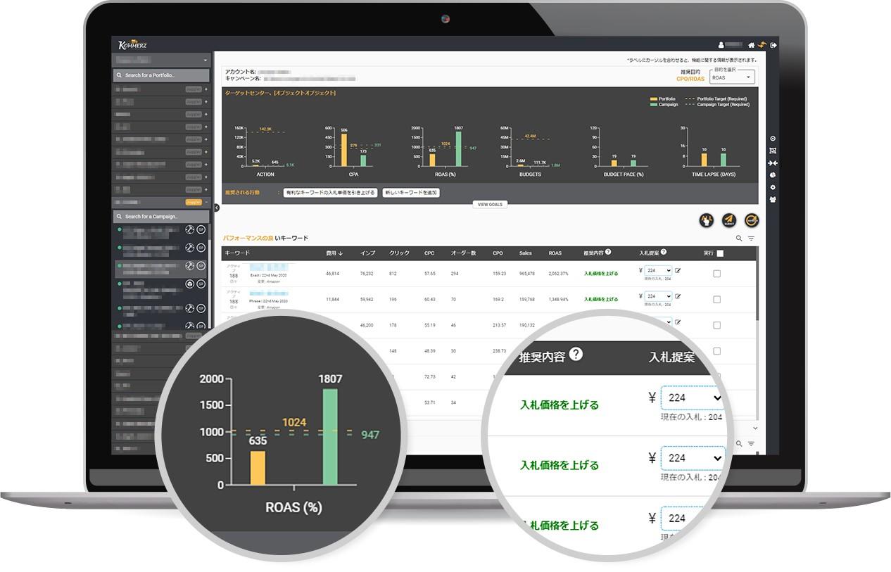 運用担当者は、管理画面において「Kommerz™」から推奨される入札戦略や、追加・停止キーワードの提案などを活用し、KPI達成に向けた意思決定を画面上で実行します