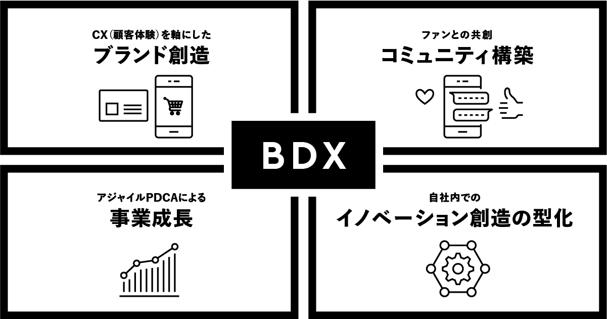 このような背景から、デジタルマーケティング全領域を網羅し、デジタルコマース領域においても高い専門性と運用力を持つ電通デジタルと、新しい時代の価値観やユーザー起点を軸とした事業開発に取り組むNEW STANDARD社が連携し、企業起点であった従来とは全く異なる「デジタルを活用したユーザー起点」を軸としたブランドの創造・価値最大化を目指します。私たちはこれをBDXと定義し、本サービスの推進を通して新しいマーケットを創出します。