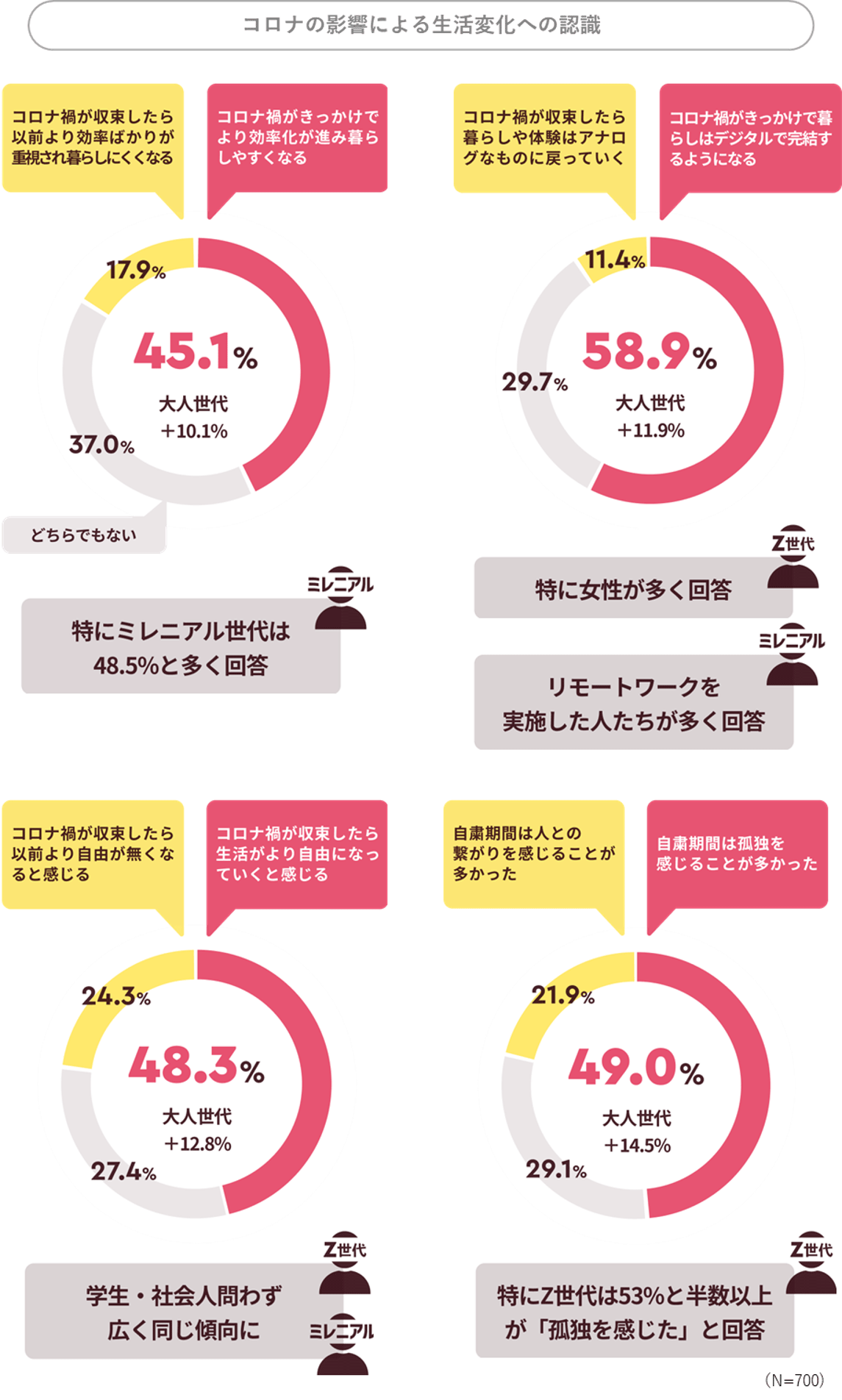 デジタルネイティブはコロナ禍の生活について、「コロナ禍がきっかけでより効率化が進み暮らしやすくなる」(45.1%)、「暮らしはデジタルで完結するようになる」(58.9%)、「(収束したら)生活がより自由になっていく」(48.3%)などと回答。