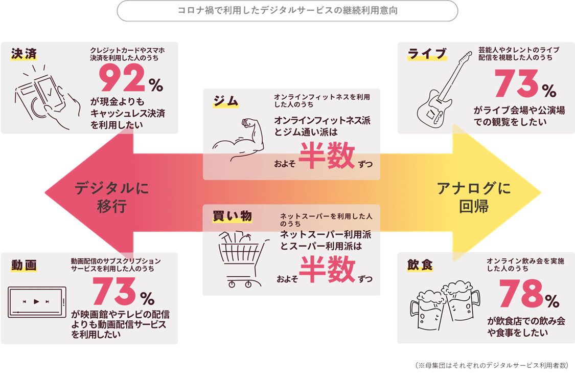 今後はデジタルで効率化していきたいものとリアルでの価値を大事にしたいものとの2分野で、サービスが使い分けられていく兆しが伺えます。