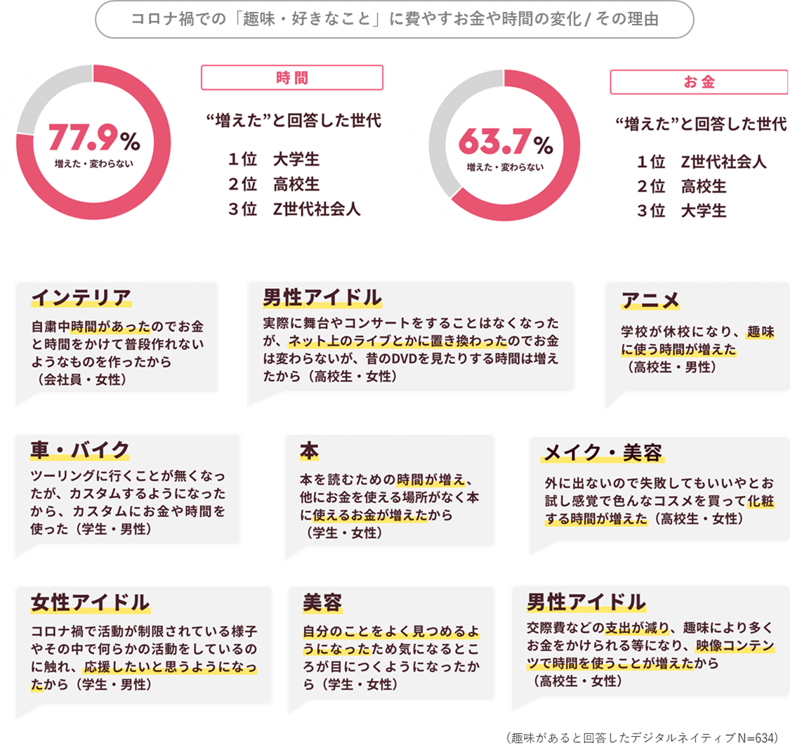 コロナ禍で「貯金をしたいと思い始めた」(51%)※など貯蓄意向が高まった一方、好きなことや趣味に費やすお金は「増加・または変わらない」という回答が63.7%、時間はさらに多く77.9%に上りました。理由としては「交際費が減った」「余暇時間が増えた」といった声が多く、デジタルで効率化した生活を土台に好きなことには積極的に投資する姿勢が伺えます。