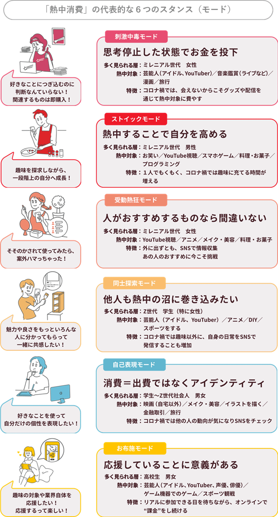 YNGpot. ™では、好きなこと/趣味に対する消費を「熱中消費」と名付け、デジタルネイティブ世代が熱量を注ぐ趣味とその楽しみ方に着目し、コロナ禍における消費の仕方に特徴的な6つのスタンス(熱中消費モード)があることを捉えました。