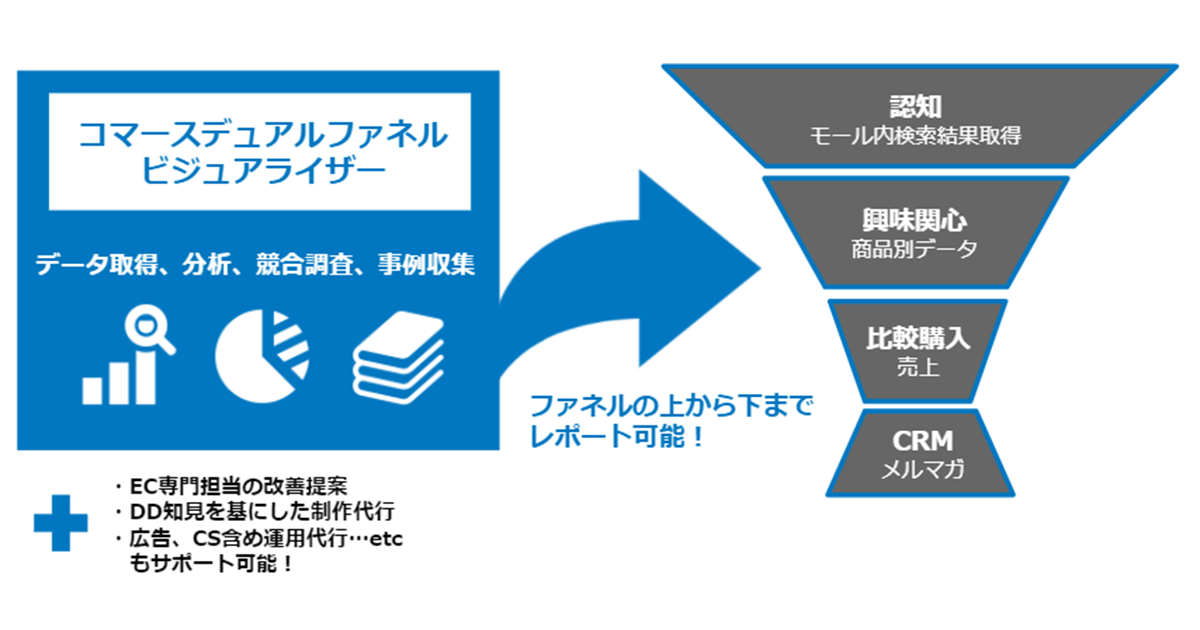 株式会社電通デジタル(本社:東京都港区 代表取締役社長執行役員:川上 宗一 以下、電通デジタル)は、企業のEC事業推進において、ECモールに特化し成果最大化を支援する分析ソリューション「コマースデュアルファネルビジュアライザー」を、本日より提供開始します。