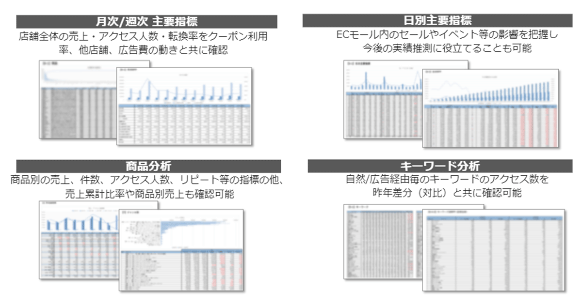 この「コマースデュアルファネルビジュアライザー」では、各ECモールの管理画面上から取得できる膨大なデータを活用して、競合を含めた検索順位結果や商品単位のレビュー、購買後の既存顧客向けメルマガ施策の効果検証データなど、予め設定した必要情報を抽出し、自動でレポート生成を行います。CSVやExcelでダウンロードできないECモール内の検索結果やメルマガの配信結果のような取得が難しいデータも分析・蓄積し、過去比較することができます。また、ECモール内にオンラインショップを開設していない企業や量販店、卸売業者においても、競合比較で出品商品の露出状況やレビューが確認でき、ECモール内のSEO対策や競合調査を行うことで、売上改善施策として活用することができます。