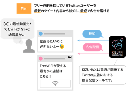 なお、トライアルとして、Wi-Fiのアクセスポイントを探すツイートを行ったユーザーに対し、Wi-Fiが設置されている近隣店舗への送客を促す大手飲食店の広告を配信。結果、Twitter上の顧客体験が向上し、「キーワードターゲティング」と比較してCTR※2が約2倍に改善、広告効果の向上につながりました。