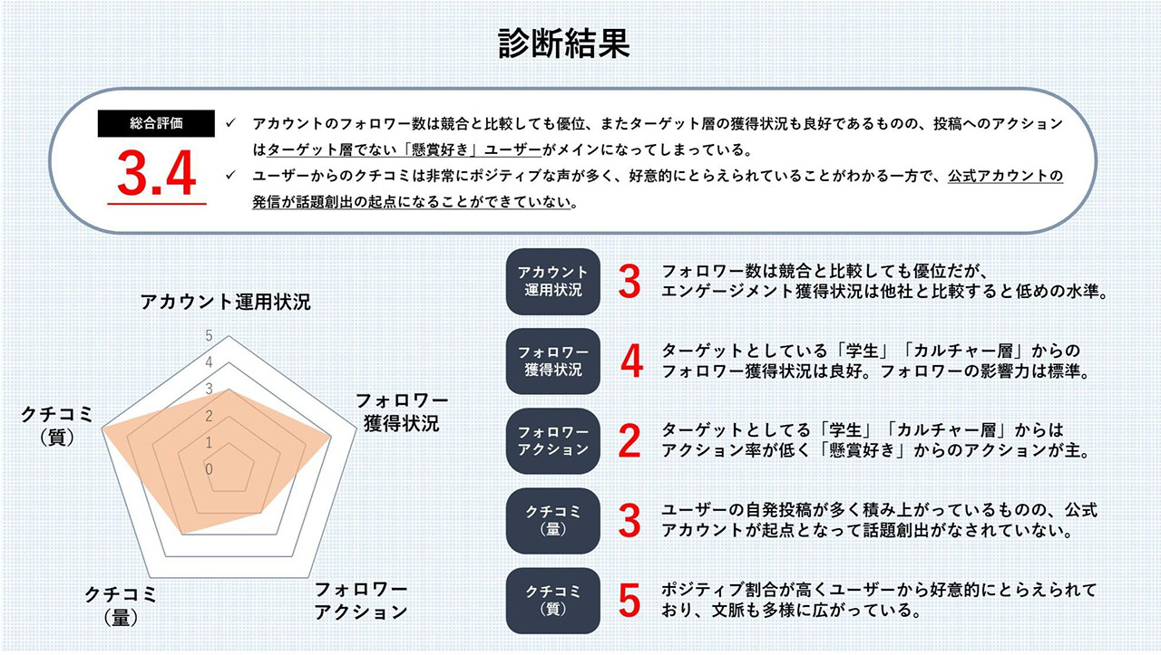 これらの分析結果と電通デジタルのアカウント戦略コンサルティングや運用の実績に基づく知見をもとに、アカウントのSNS上のコンディションを数値化し、サマリーに加え、SNSコミュニケーションにおける課題を提示します。