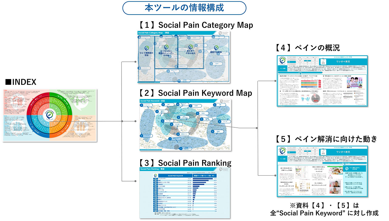 「Social Pain Compass」は、ソーシャルメディア上の生活者の声を分析することで、生活者が社会的な不満として捉えている事象を特定しながら、200個を超える"Social Pain Keyword" を抽出しまとめた、社会不満探索支援ツールです。