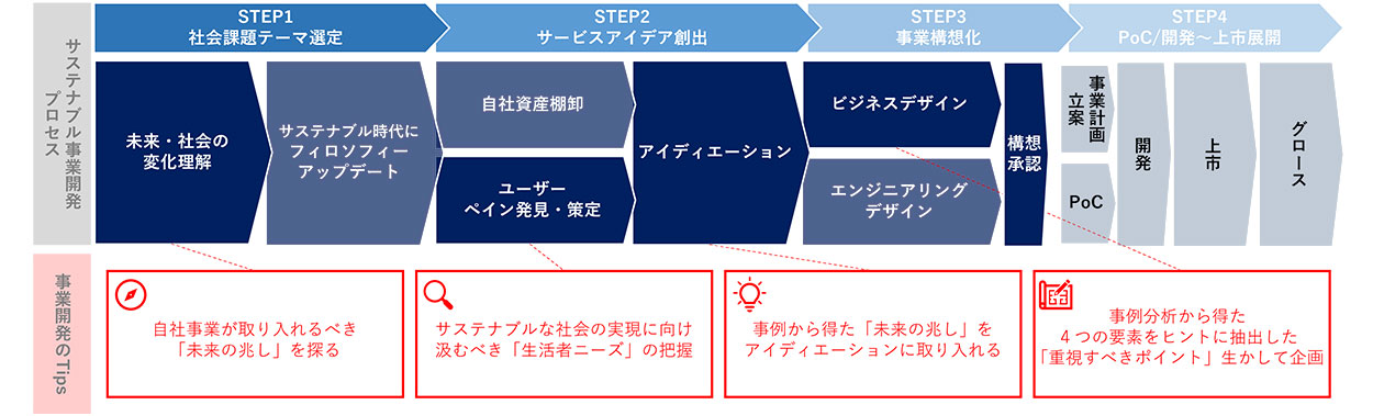 「サステナブルな社会でのスタンダード(未来の兆し)」の発見を支援するために、70の先行事例を分析。サステナブル経営の実現において重視すべきポイントを事例から抽出した独自ツール「サステナブルフューチャーナビ」を開発しました。この分析から、サステナブルな事業開発には「生活者ニーズを捉えた体験設計」「ステークホルダーも共感するパーパス設計」「パートナー選定/連携方法」「持続的に事業が回る仕掛け」という4つの要素が重要であると考察。この4つの要素を生かし、生活者視点と未来志向で事業開発を支援します。