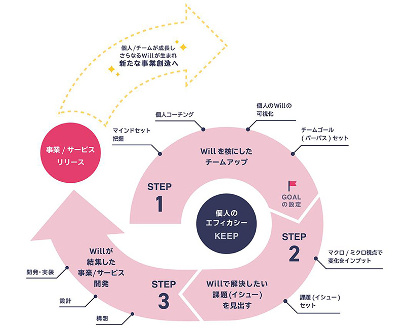 その上で、ステップ1で定めたチームのゴールに向けて取り組むべき課題を定め、それを基点にアイディエーション、サービスデザイン、ビジネスデザイン、受容性評価などをチームの意志(Will)と照らし合わせながら実施します。これらのプロセスを経て、一人ひとりの意志(Will)がこもった事業/サービス案を立案していきます。