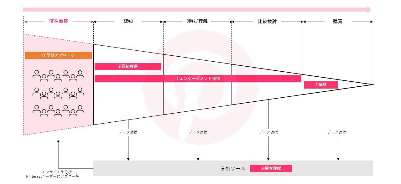 Pinterestでアイデアを探すユーザーのインスピレーション源としてプロダクト/サービスの認知を広告とオーガニックによるリーチを駆使して獲得します。Pinterestは非指名検索率97%で、一般的な検索エンジンに比べてトレンドが早期に検索される傾向があるため、認知度に課題があるブランドであっても早い段階でユーザーにアプローチすることが可能です。 -