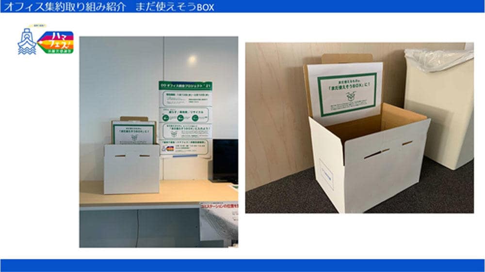 飯野 オフィスの統合にあたっては、環境に配慮したゴミの分別など、いろいろな取り組みがありました。「まだ使えそうBOX」もその1つです。退去の際には捨てるものがたくさん出ますが、その中でまだ使えそうなものをこのBOXに入れてもらって、欲しい社員に配布したり、寄贈したりするんです。