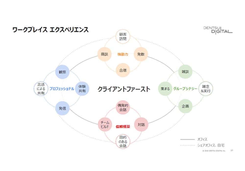 電通デジタルでは以前から新しいワークスタイルに基づいた取り組みを行っています。その中で、会社が社員に「どのような振る舞いをしてほしいのか」を議論して、オフィスで行ったほうがより高まるもの、オフィスでなくてもできることを図にした「ワークプレイス エクスペリエンス」を作成しました。そしてこれに基づいて、オフィスに実装する機能を構想しています。